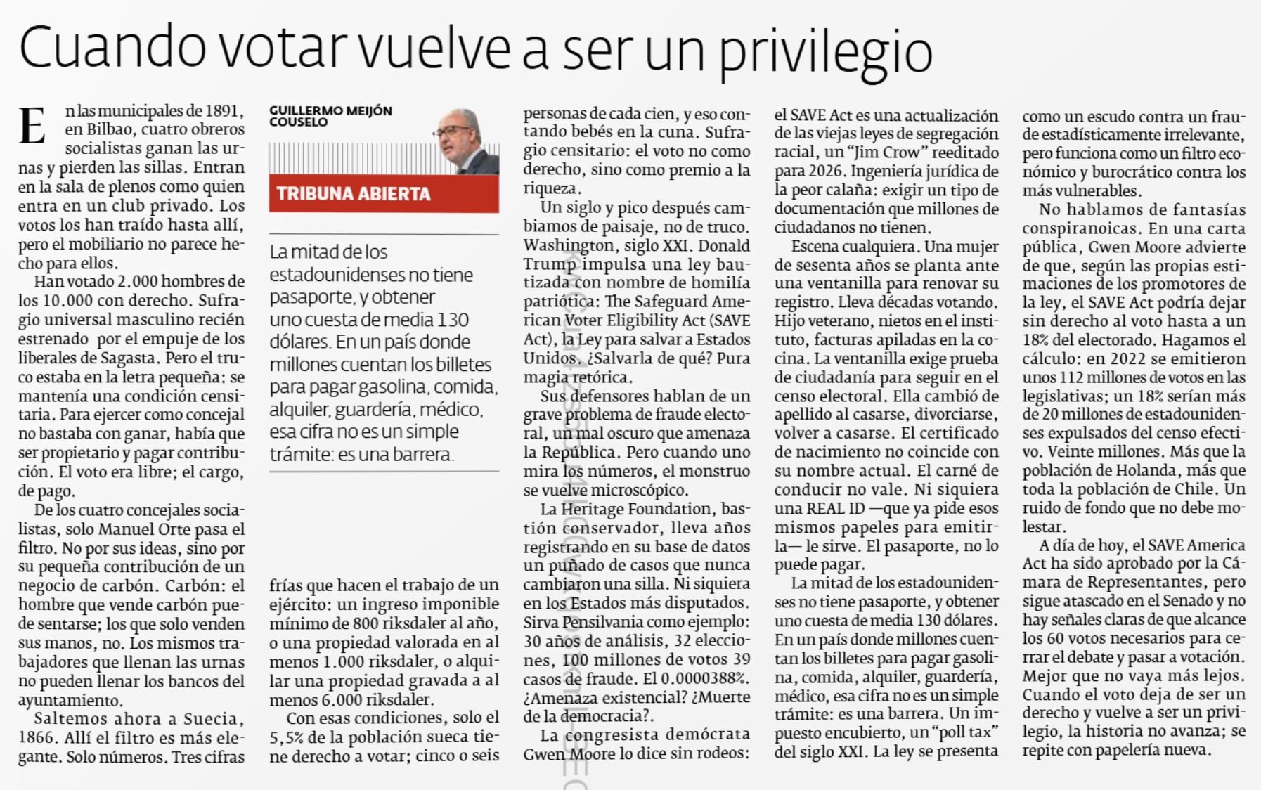 A día de hoxe, o SAVE America Act foi aprobado pola Cámara de Representantes, pero segue atrancado no Senado e non hai sinais claros de que alcance os 60 votos necesarios para pechar o debate e pasar a votación. Mellor que non vaia máis lonxe. Cando o voto deixa de ser un dereito e volve ser un privilexio, a historia non avanza; repítese con papelería nova.