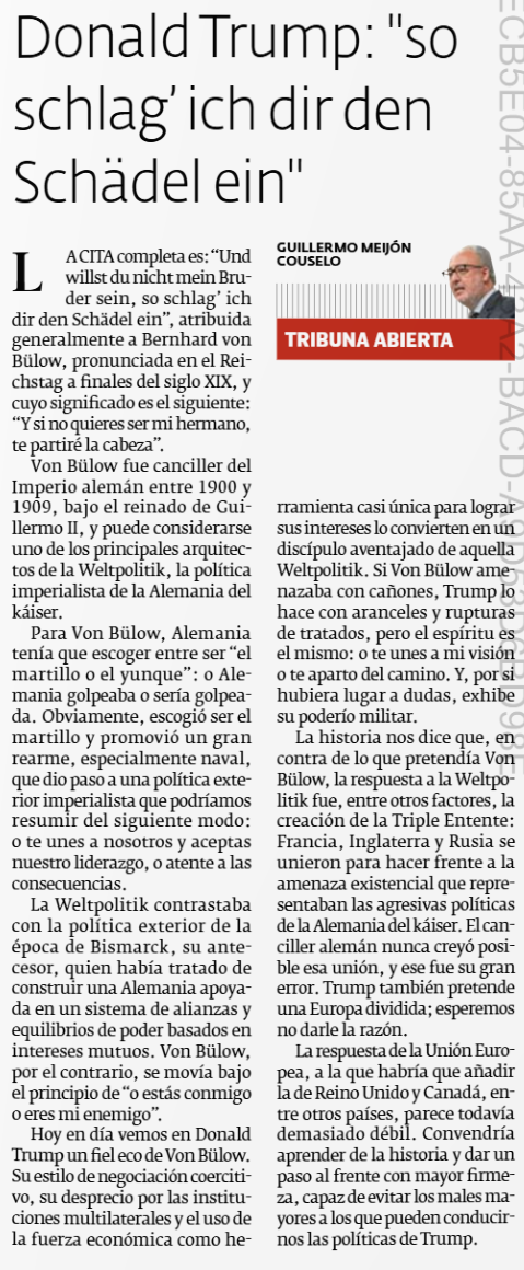 Hoxe en día vemos en Donald Trump un fiel eco de Von Bülow. O seu estilo de negociación coercitivo, o seu desprezo polas institucións multilaterais e o uso da forza económica como ferramenta case única para lograr os seus intereses convérteno nun discípulo avantaxado daquela Weltpolitik. Se Von Bülow ameazaba con canóns, Trump faio con aranceis e rupturas de tratados, pero o espírito é o mesmo: ou úneste á miña visión ou apártote do camiño. E, por se houbese lugar a dúbidas, exhibe o seu poderío militar.