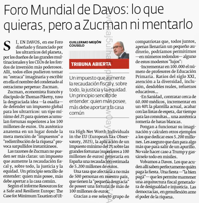 Volvamos a Davos. Los que acuden allí saben perfectamente quién paga la fiesta. Una fiesta —“la bien pagá”— que les permite mantener una arquitectura fiscal generadora de desigualdad e injusticia. Las democracias, en genuflexión ante el poder de la riqueza.