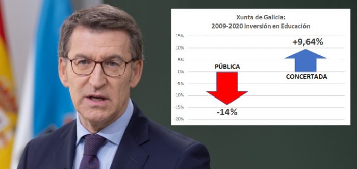 Si tenemos en cuenta el Índice de Precios al Consumo (IPC) y lo aplicamos a los presupuestos de la Xunta de Galicia en las partidas destinadas a inversión educativa en la enseñanza pública no universitaria y a las destinadas a los conciertos educativos, veremos que mientras la inversión en la red pública cayó en un 14%, en la red concertada se incrementó en un 9,64%.