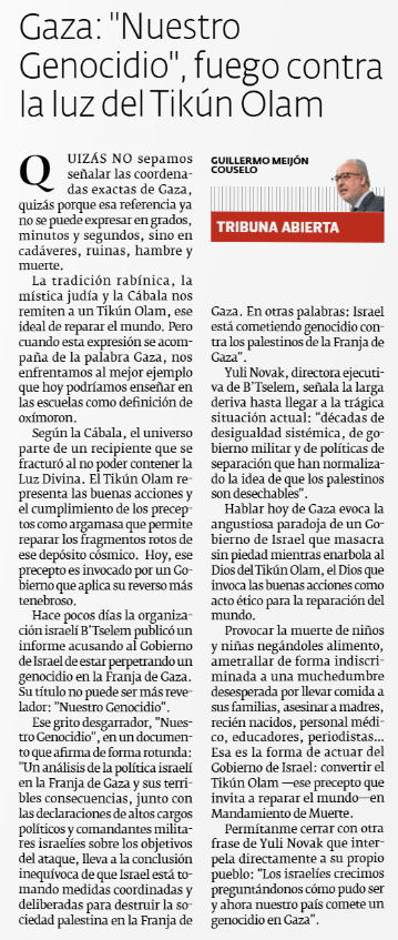 Falar hoxe de Gaza evoca o angustioso paradoxo dun Goberno de Israel que masacra sen piedade mentres enarbora ao Deus do Tikún Olam, o Deus que invoca as boas accións como acto ético para a reparación do mundo.