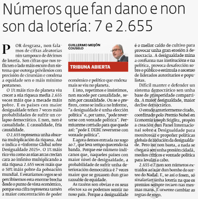 O 2.655 representa unha obscena multiplicación da riqueza. Así o indica o «Informe Global sobre Desigualdade 2025». O 1% máis rico viu como as súas arcas crecían cara ao infinito multiplicando a súa riqueza 2.655 veces máis que o 50% máis pobre da poboación mundial. E estariamos cegos se só percibísemos esta enorme brecha desde o punto de vista económico, porque esa cifra representa tamén a maior concentración de poder económico e político que endexamais se viu no planeta.
