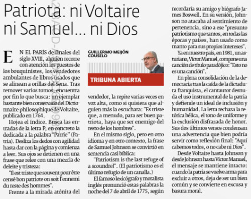 Desde Voltaire ata Johnson e desde Johnson ata Víctor Manuel, a mensaxe mantense intacta: cando a patria vólvese arma para excluír a outros, deixa de ser un ben común e convértese en escusa e lixo moral.