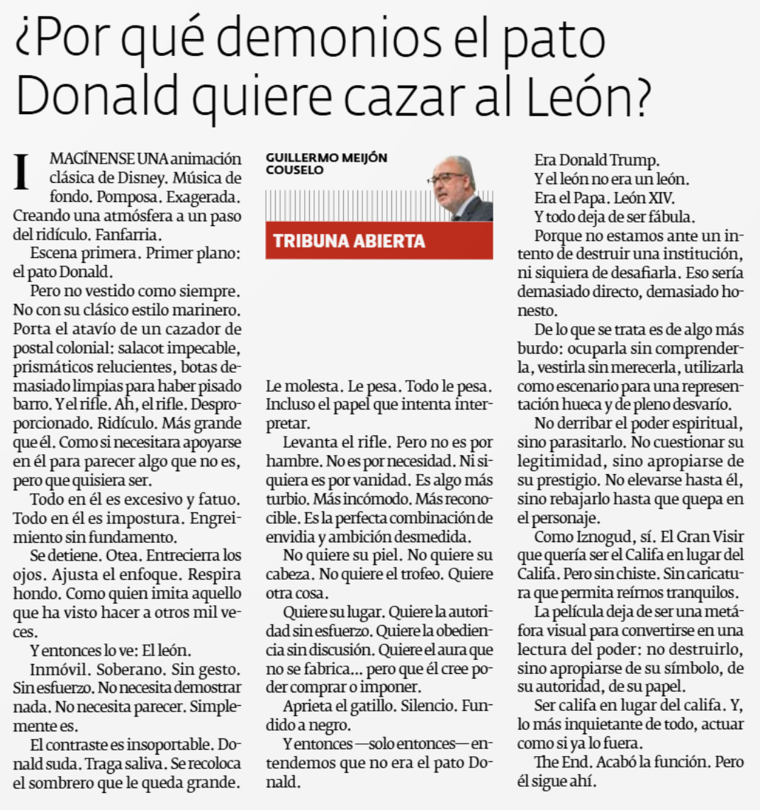Non quere a súa pel. Non quere a súa cabeza. Non quere o trofeo. Quere outra cousa. Quere o seu lugar. Quere a autoridade sen esforzo. Quere a obediencia sen discusión. Quere a aura que non se fabrica… pero que el cree poder comprar ou impoñer.