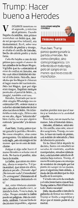 Pois ben, Trump parece querer gañarlle a partida a Herodes. Non como cómplice, senón como protagonista. Un infanticida en toda regra, pero sen sangue nas mans -que non é cousa de mancharse-.