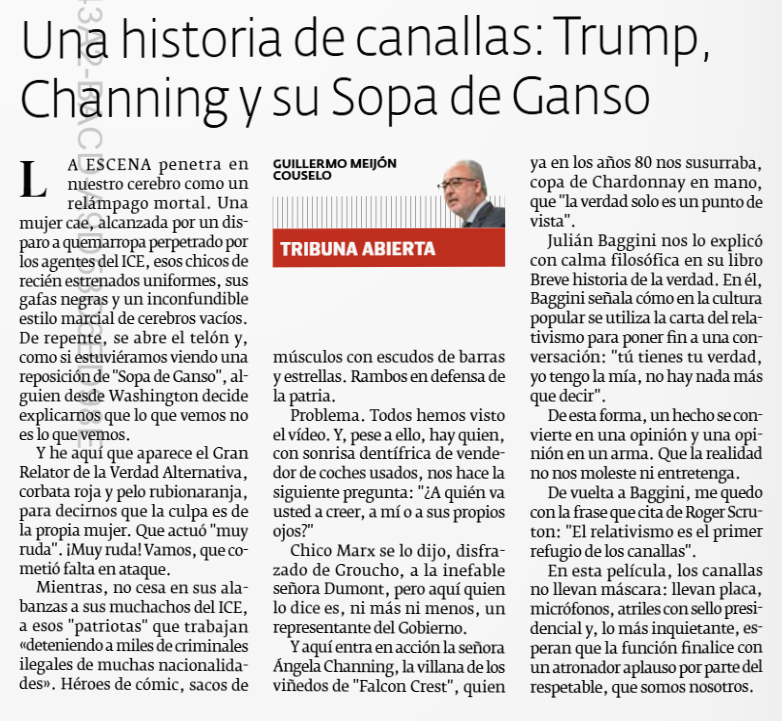 A escena penetra no noso cerebro como un lóstrego mortal. Unha muller cae, alcanzada por un disparo a queimarroupa perpetrado polos axentes do ICE, eses mozos de recentemente estreados uniformes, as súas lentes negras e un inconfundible estilo marcial de cerebros baleiros. De súpeto, ábrese o pano e, coma se estivésemos a ver unha reposición de «Sopa de Ganso», alguén desde Washington decide explicarnos que o que vemos non é o que vemos.